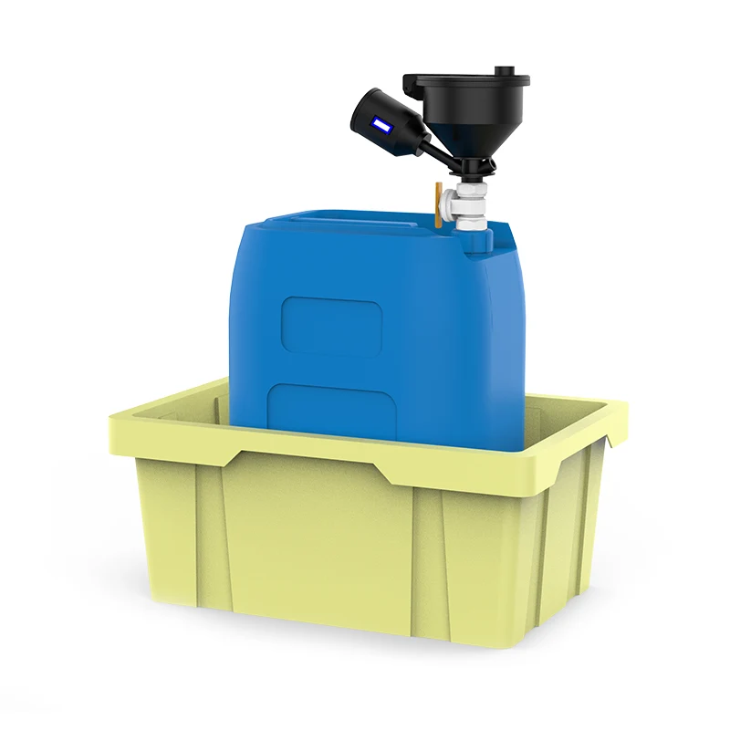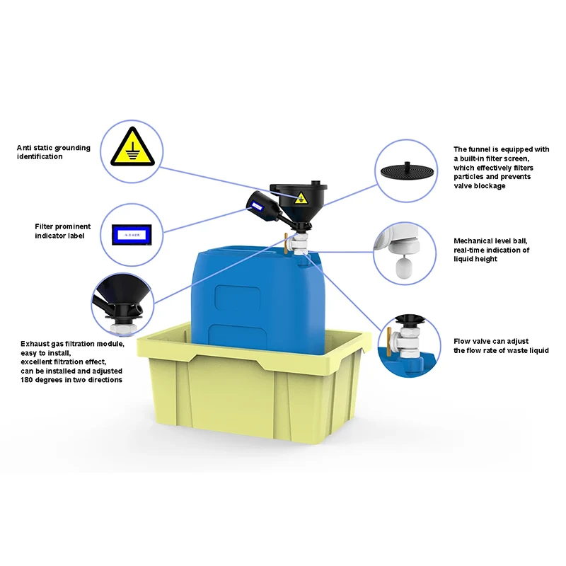 Tá tréithe suntasacha ag an bhfeiste bailithe leacht dramhaíola. Déantar an coimeádán bailiúcháin d'amhábhair PP frith-statacha allmhairithe, rud a áirithíonn ní hamháin cobhsaíocht an ábhair ach freisin a fheidhmíonn go héifeachtach feidhm an ghníomhaire fhrithstatach, ag rialú leictreachas statach an tonnadóir leacht dramhaíola laistigh den raon 10 ^ 5 go 10 ^ 9, ag laghdú go mór an baol tubaistí de bharr leictreachas statach. Tá dearadh sofaisticiúil ag an tonnadóir. Tá an clúdach barr sceite-dhíonach péireáilte le clúdach séalaithe agus tonnadóir scagaire splancscáileán, agus is féidir comhla a shuiteáil de réir mar is gá chun sábháilteacht stórála leacht dramhaíola a chinntiú. Déanann an clúdach barr cineál counterweight an t-astúchán gáis sceite a choigeartú go huathoibríoch de réir na gcoinníollacha brú inmheánacha oscailt ag 100Pa agus dúnta ag 50Pa, ag seachaint pléascadh agus dócháin spontáineach. Tá an scagaire gáis sceite ceangailte ar bhealach bíseach, atá áisiúil le haghaidh athsholáthair agus a chuireann cosc ar volatilization na gcomhpháirteanna ceimiceacha. Tá 5 chineál éagsúil ar fáil le haghaidh oiriúnú beacht ar chóireálacha éagsúla gáis sceite.